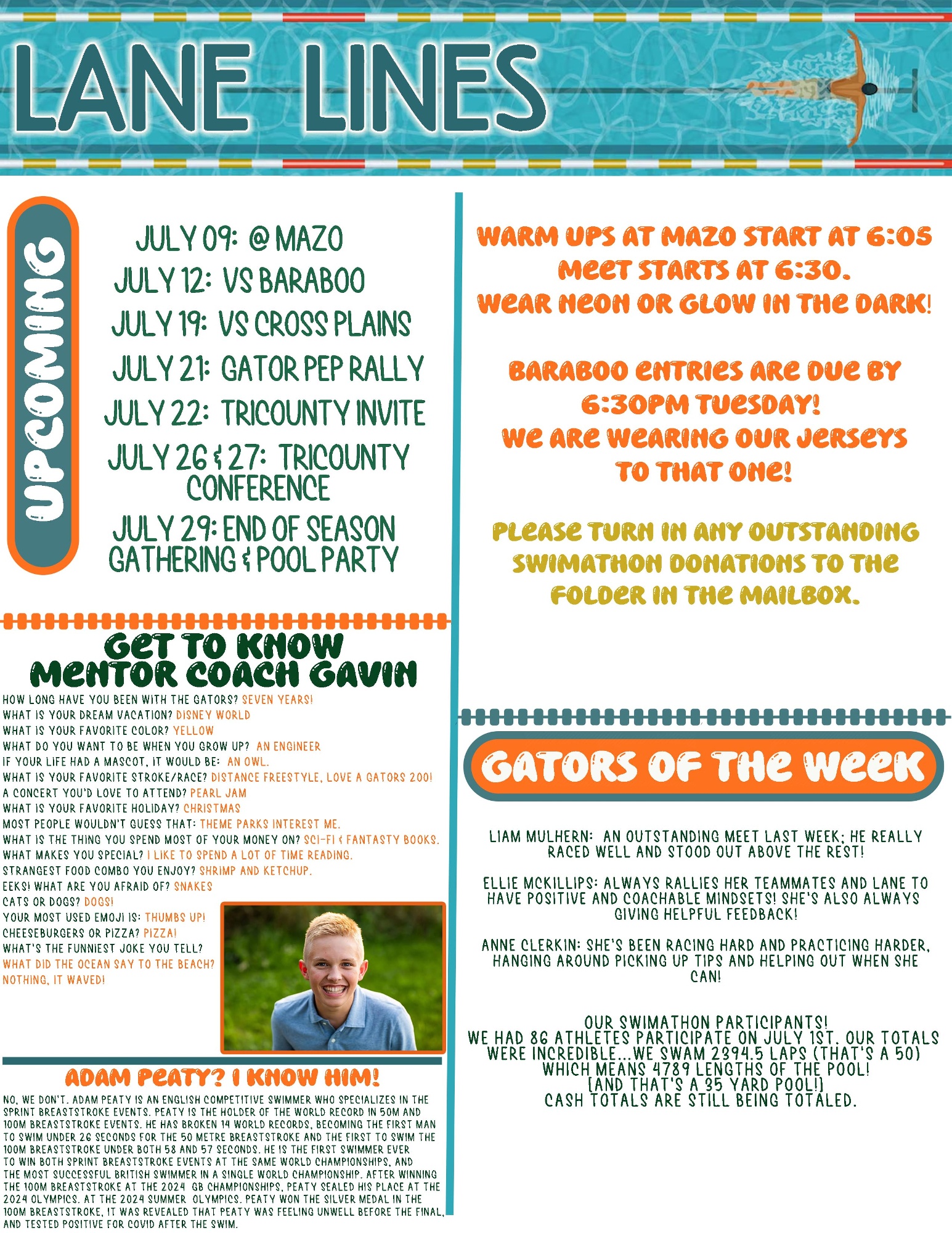 Entries this week took us a bit more time than usual. We've been racing so well, we put some extra time into our events and strategies in hopes of a Gator W. Let's get those Cudas! Warm ups start at 6:05, please be prompt; meet begins at 630. The 8Under Free Relays will happen before the IMs, due to the night meet starting late and us wanting to get our littlest athletes home earlier. Please look over the entries carefully and talk with your athletes. Wear your glow sticks, your glow in the dark, and your neon!